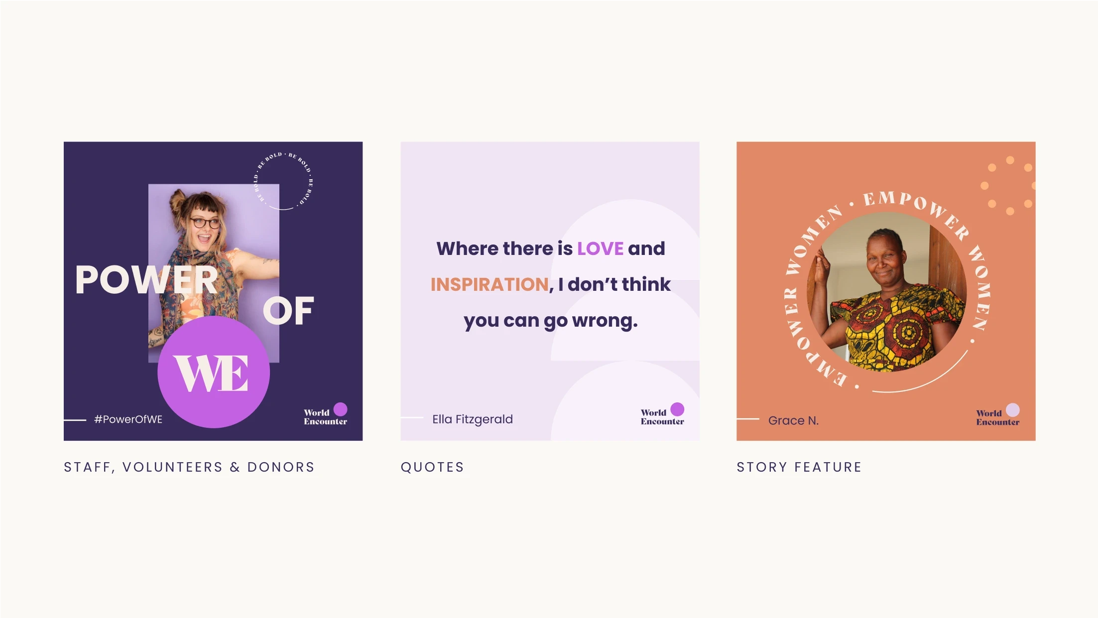 I developed a new brand identity system grounded in World Encounter’s core values: empowerment, community, and growth. The design language is vibrant and optimistic, with rich color palettes and custom iconography inspired by global connection and entrepreneurial journeys. The brand voice was refreshed to be warm, inclusive, and action-oriented—making it easier for World Encounter to tell the stories of the women they serve and invite others to join the mission.